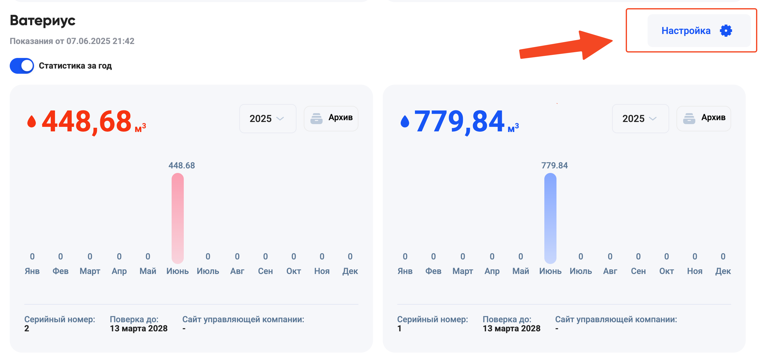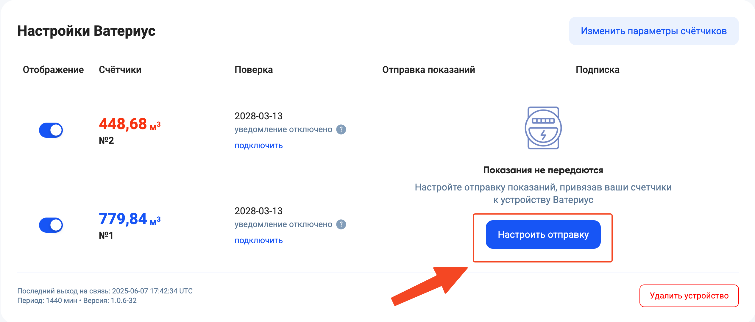 2. Нажмите «Настройка» справа от конкретного Ватериуса, показания которого вы хотите отправлять в УК.