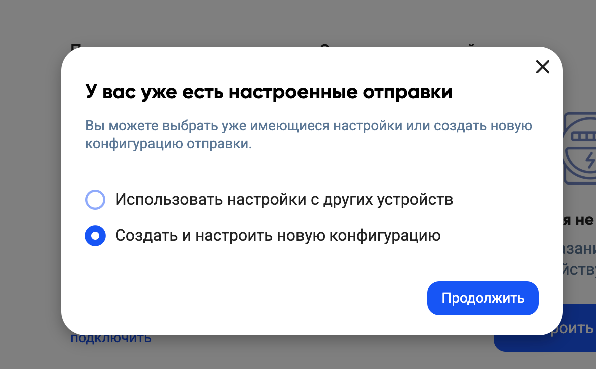 4. Если у вас уже есть настроенные отправки, то появится окно. Если вы настраиваете первый Ватериус в квартире, то выберите «Создать и настроить новую конфигурацию». Если вы настраиваете второй Ватериус в квартире, выберите «Использовать настройки с других устройств».