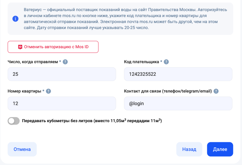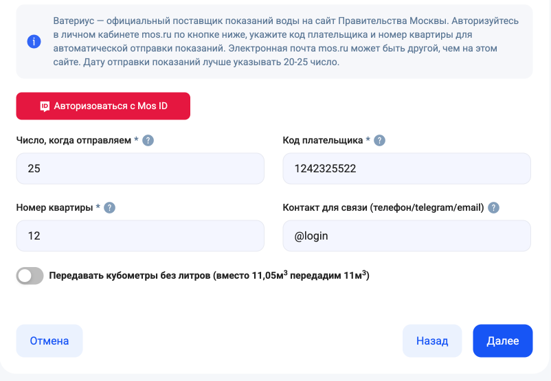 Мы не храним логин и пароль от mos.ru, а авторизируемся при помощи технологии OAuth – вы переходите на сайт mos.ru и там разрешаете нам передавать Ваши показания.