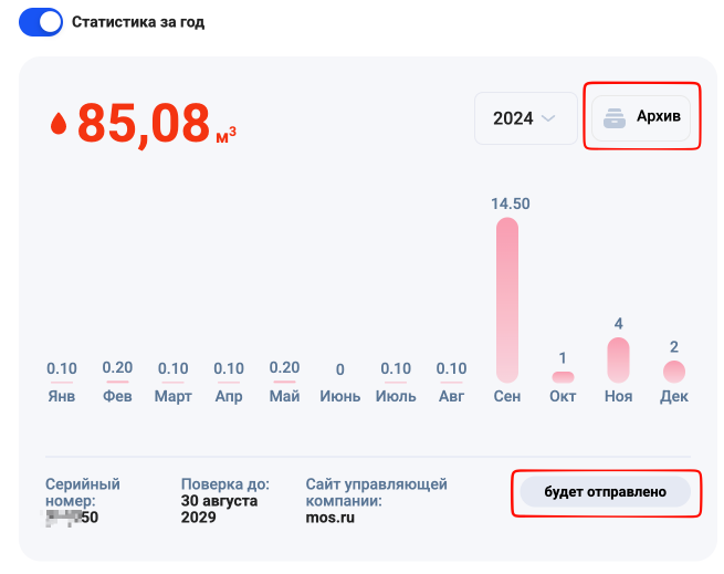 Вы можете посмотреть архив переданных показаний нажав кнопку Архив.