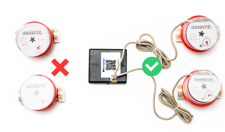 На картинке слева счётчик воды БЕЗ провода (импульсного выхода) и С импульсным выходом. Если вы не понимаете, какой у вас — скиньте нам фото счётчика (в онлайн чат или tg-бот)